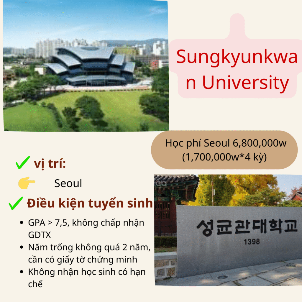 Với bề dày lịch sử hơn 600 năm, Sungkyunkwan hiện là một trong những trường Đại học hàng đầu tại Hàn Quốc. Với cơ sở vật chất hiện đại, hỗ trợ đầy đủ cho sinh viên trong việc học tập và nghiên cứu. Trường cũng nhận được sự đầu tư rất lớn từ tập đoàn SAMSUNG.